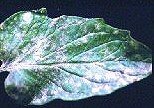問:番茄葉片上表皮有白色霉?fàn)钗,?yán)重變褐黑色造成葉片乾枯。