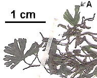 (左) 憑證標(biāo)本部分 - A: 囊苞, 著生在裂片的頂端, (右) 活株的囊苞顯微鏡照片