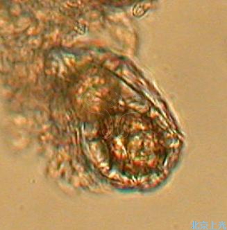 顯微鏡下觀察子囊裏可見(jiàn)黃棕色的孢子表面有網(wǎng)狀花紋。